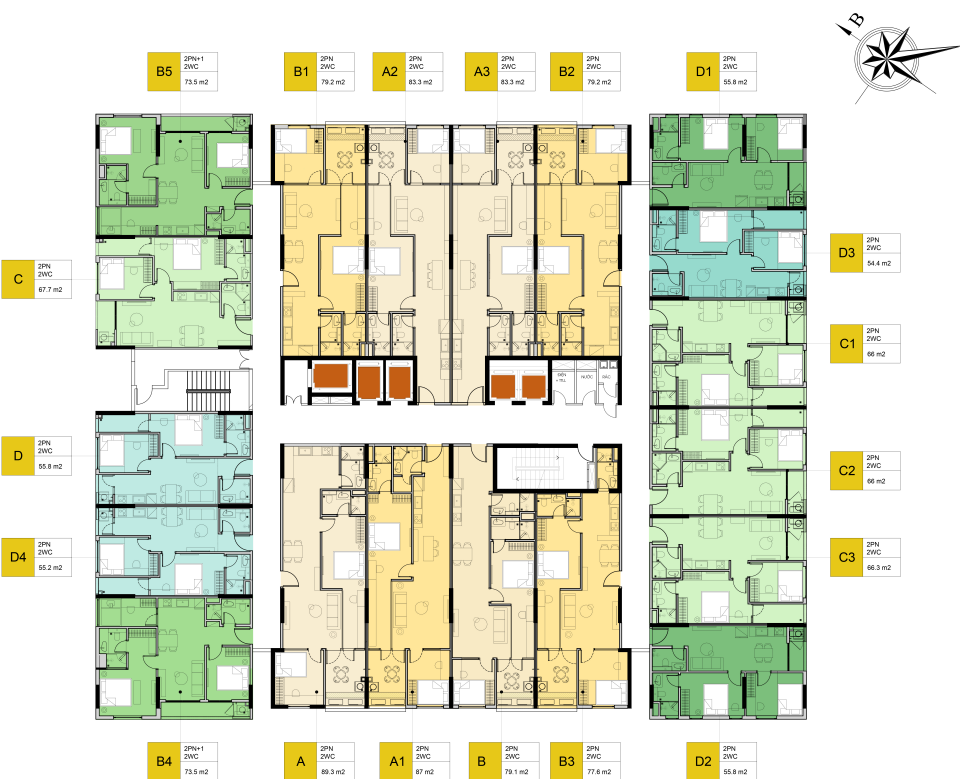 - Diện tích căn hộ: 55m2 – 66m2 – 73m2 – 79m2 – 83m2 – 89m2