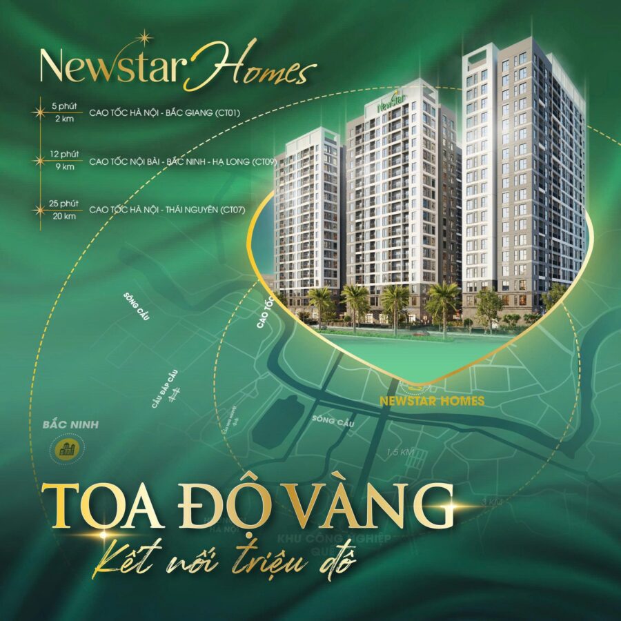 – Dự án New Star Homes Bắc Ninh nằm tại vị vàng kết nối giữa trung tâm mới của tỉnh Bắc Ninh và TP Bắc Ninh (cũ). Tọa lạc gần các khu công nghiệp trọng điểm của tỉnh, cùng phía với KCN, cư dân New Star Homes di chuyển dễ dàng, không lo tắc đường hay qua cầu chui, tiết kiệm thời gian và thuận tiện cho công việc. Vị trí thuận lợi nằm trên hành lang kinh tế Nam Ninh (Trung Quốc), Lạng Sơn, Bắc Ninh, Hà Nội, Hưng Yên, Hải Phòng, Quảng Ninh